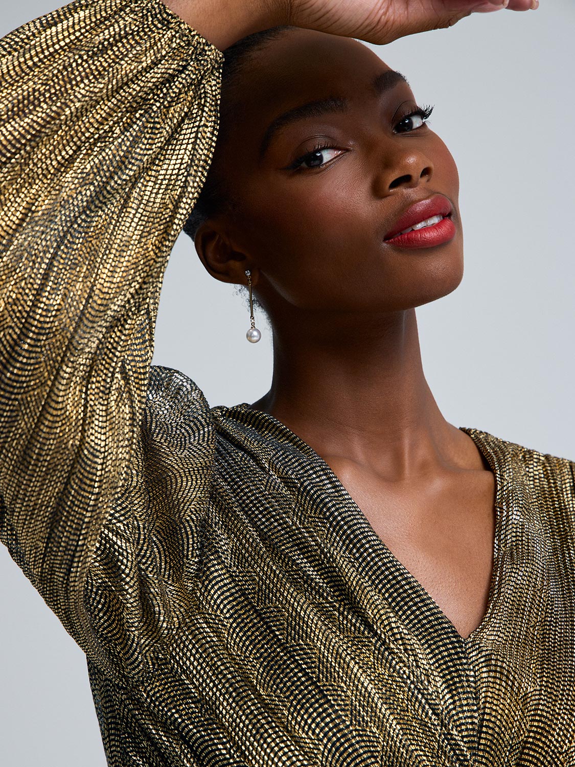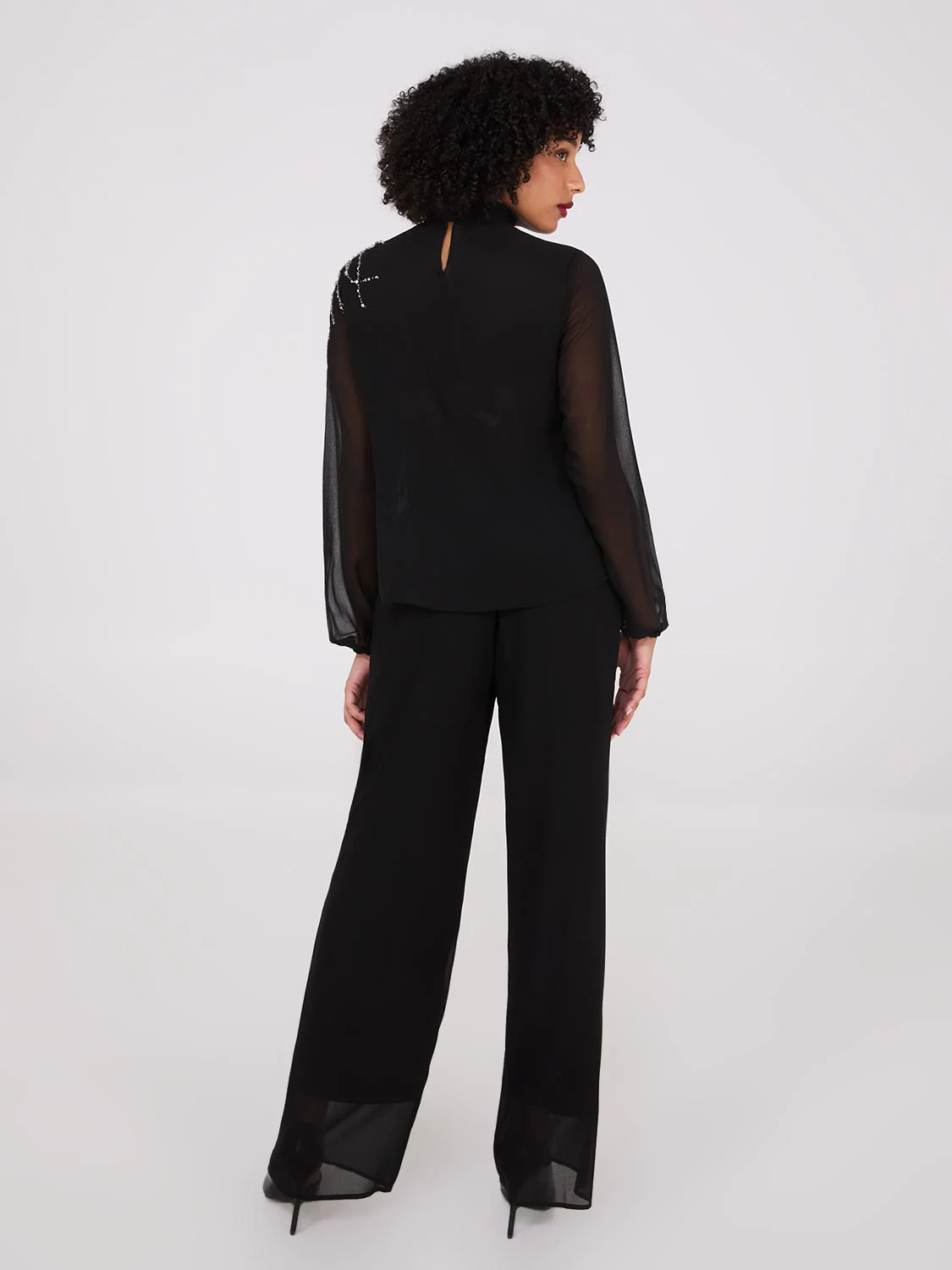 Embellished Pleated Mock Neck Top
