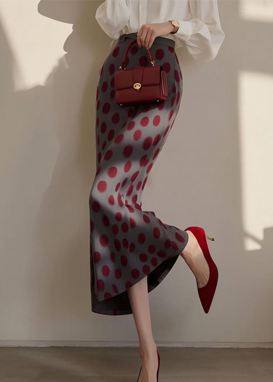 Vintage Dark Grey Dot Print High Waist Cotton Skirts Spring